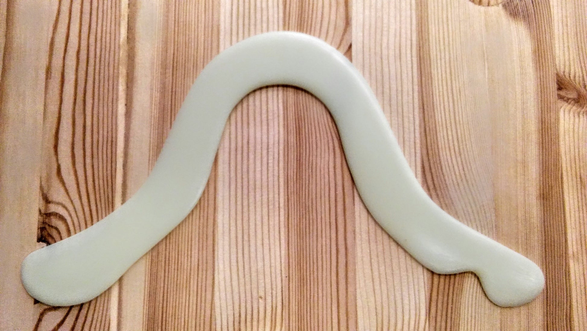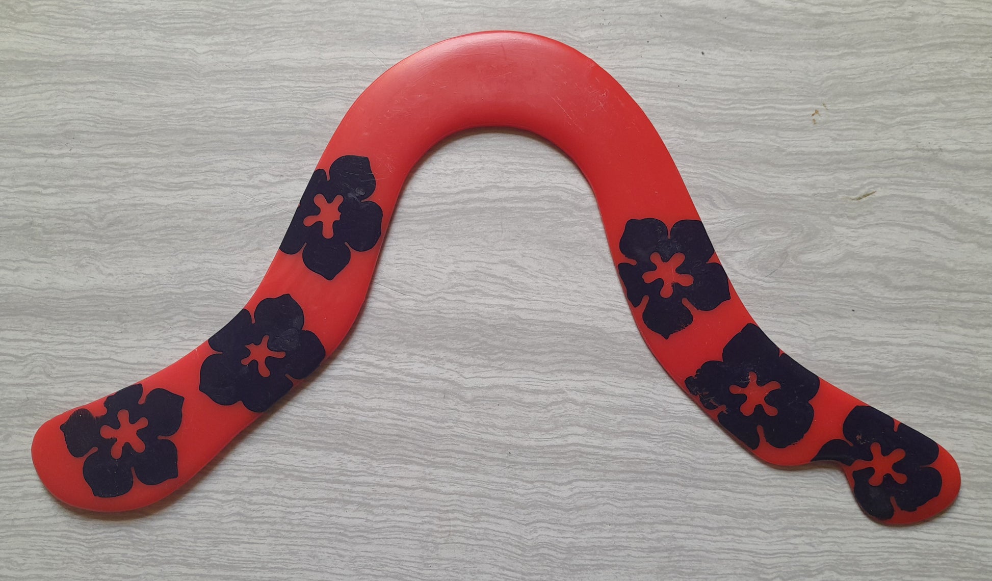 I created this unique model in 1987. One of the first boomerangs in France molded in plastic. Following my meeting with Patrice from LMI & Fox, I proposed him to design an easy boomerang for beginners. Coming from the world of competition, this will be the beginning of a long collaboration that will lead him to discover this community and work with other throwers of the 90s. The little notch at the end of the wing was a way to block the boomerang and give it more rotation when it left my hand. All my competition boomerangs were designed this way.It was then molded in different materials, such as phosphorescent, carbon, and different colored plastics.