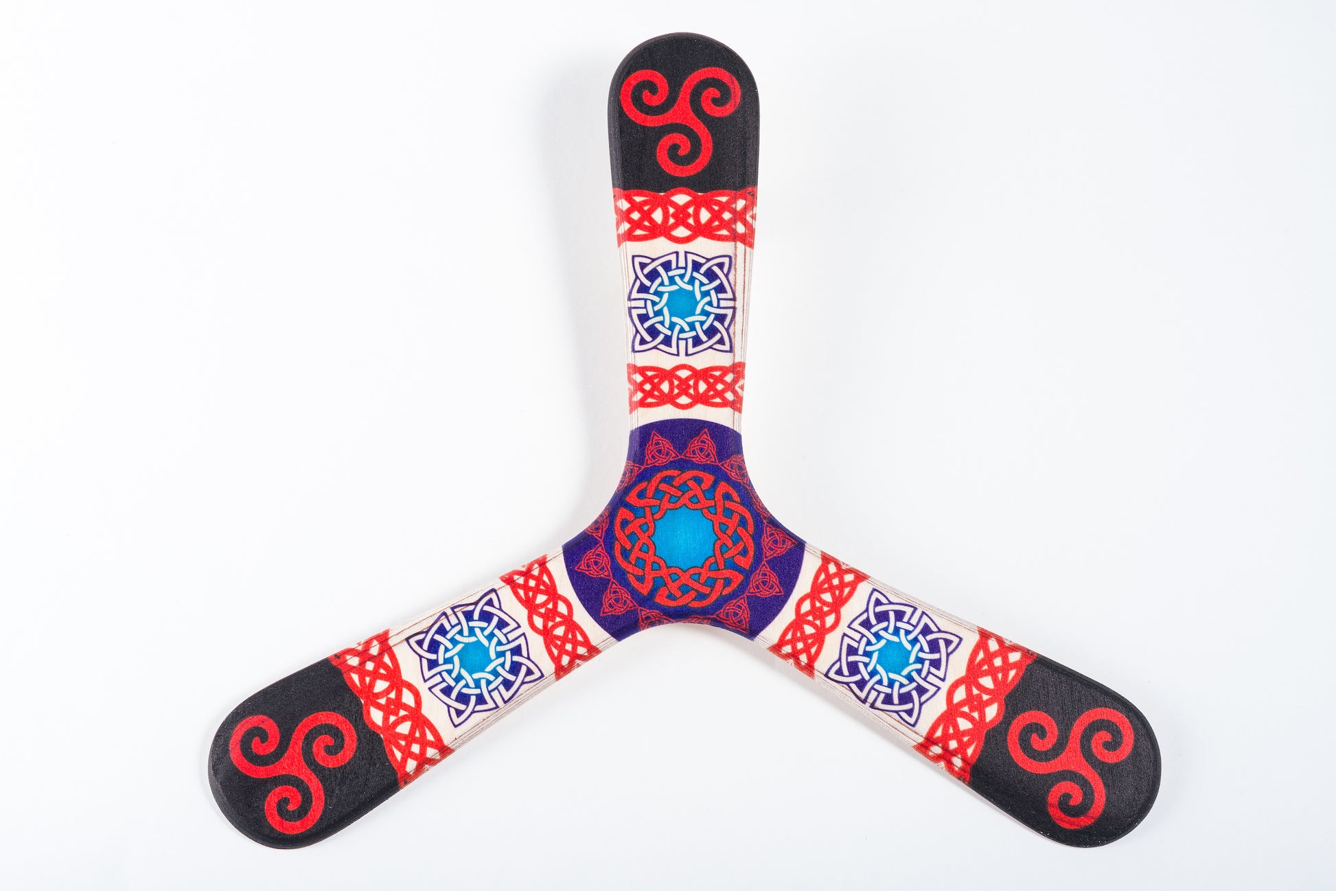 The Celtic Boomerang stands out with its distinctive symbol pattern from Irish mythology. In addition to the triskele (which means something like “three-legged”) you will find other historical design elements.