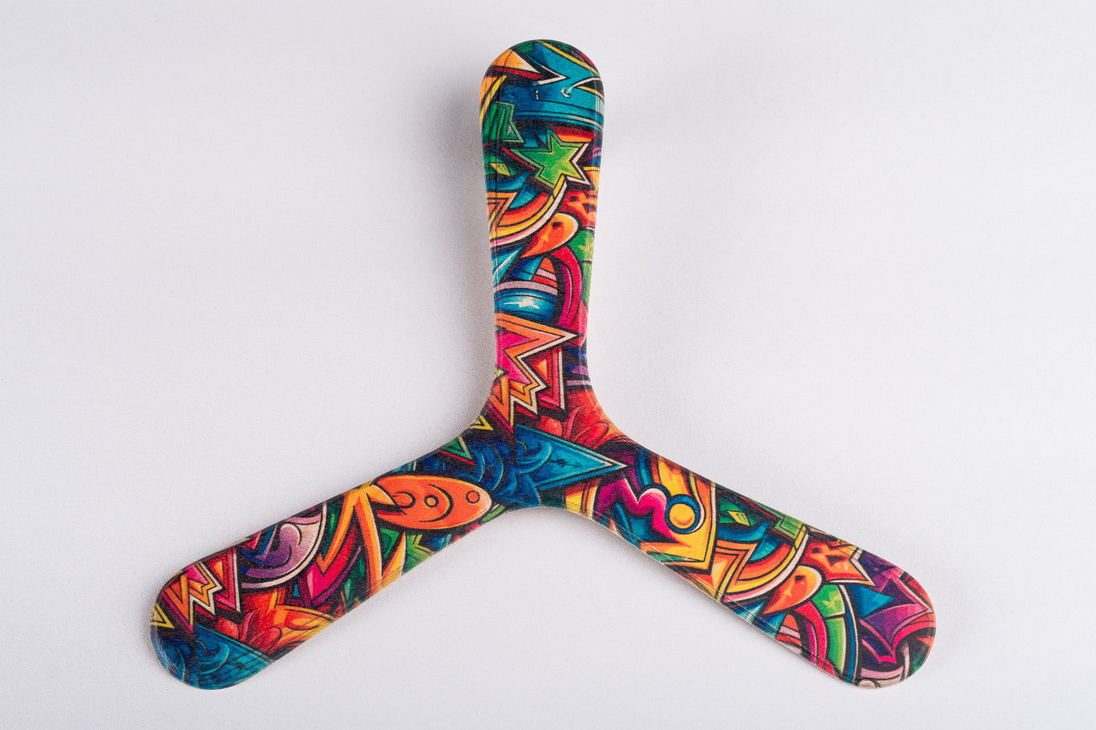 This three-bladed boomerang is ideal for beginners as it glides well and is easy to catch. Its circular and precise flight makes it perfect for learning the joy of throwing. A perfect boomerang for the whole family. It is designed for left-handed throwers only. Decorated with urban graffiti.