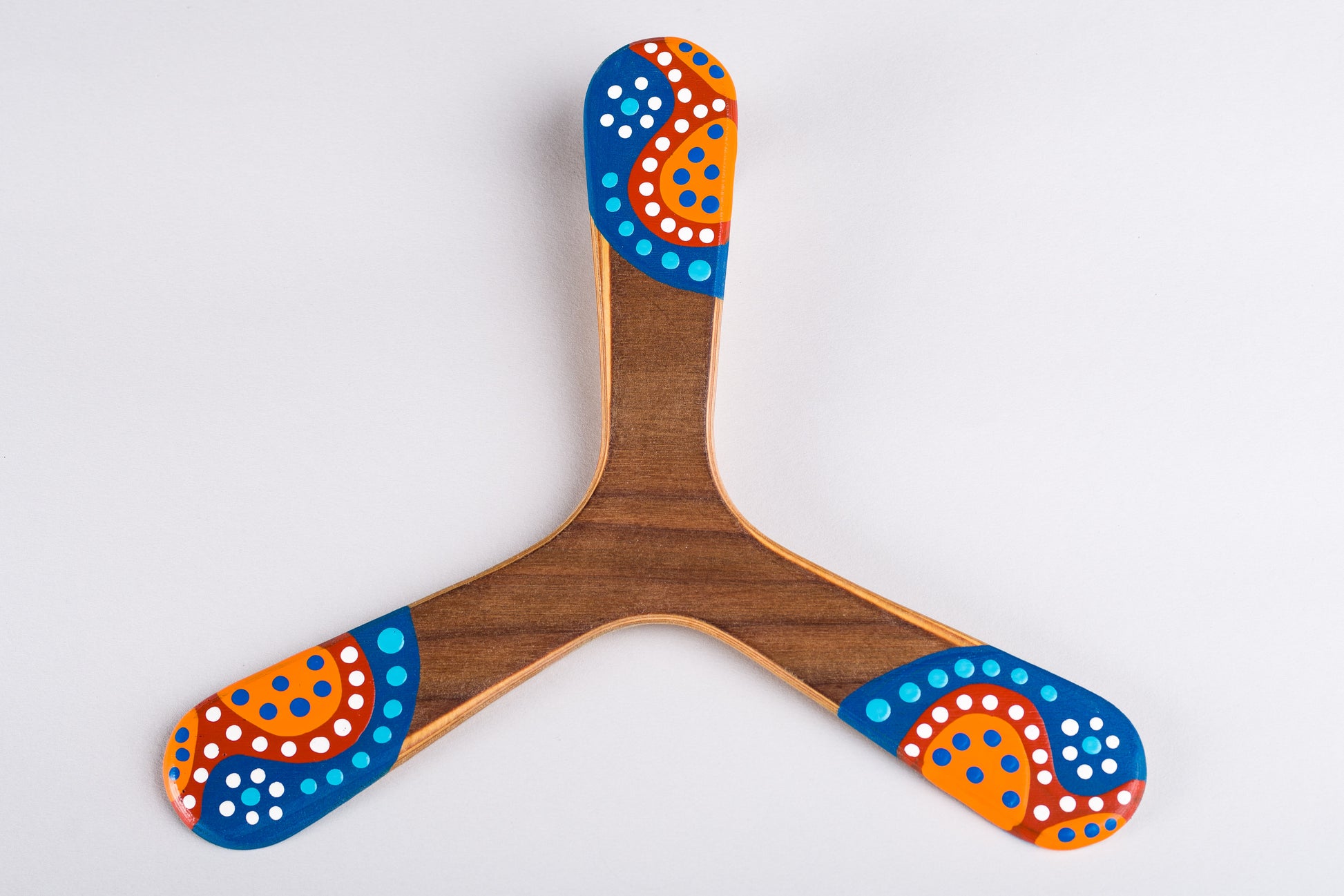 Este bumerán de tres palas es ideal para los principiantes porque se desliza fácilmente y es fácil de coger. Vuelo circular y preciso para iniciarse en los placeres del lanzamiento. Un bumerán perfecto para toda la familia. Diseñado sólo para lanzadores zurdos. Por supuesto, está decorado y firmado a mano.