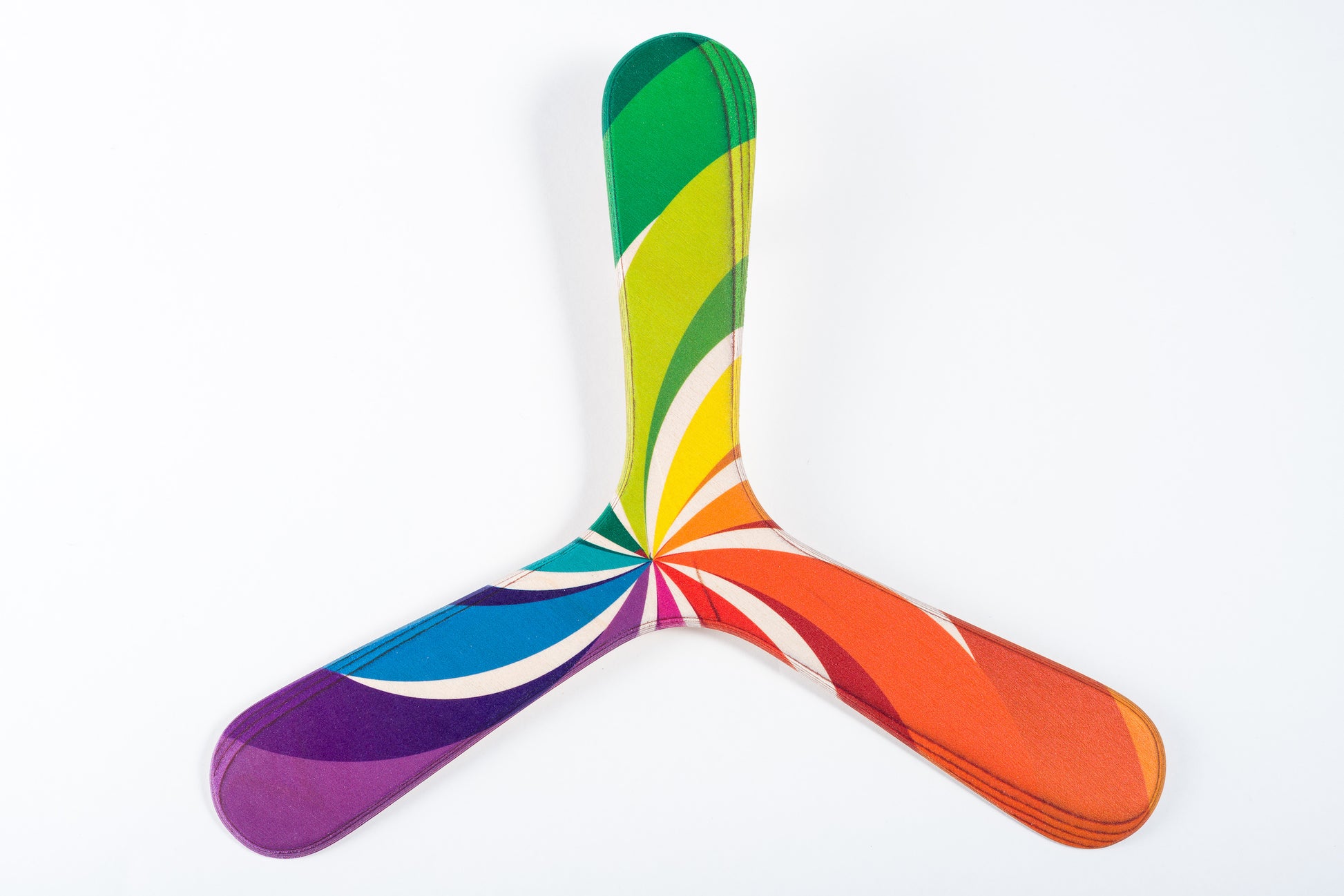 Scoprite il boomerang arcobaleno, un modello unico e originale di Wallaby Boomerangs. Perfetto per gli appassionati di boomerang e i collezionisti.
