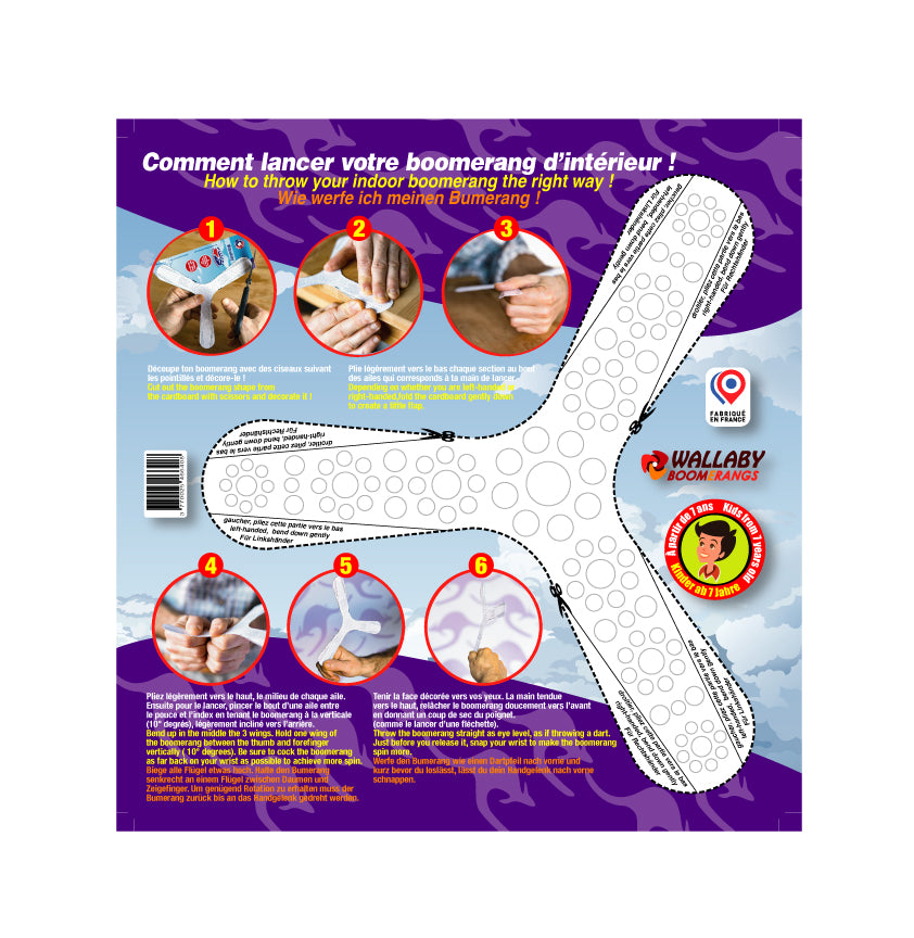 Został wydrukowany na lekkiej karcie i jest odpowiedni dla dzieci w wieku od 7 lat. Instrukcje rzucania są wydrukowane w języku francuskim, niemieckim i angielskim..