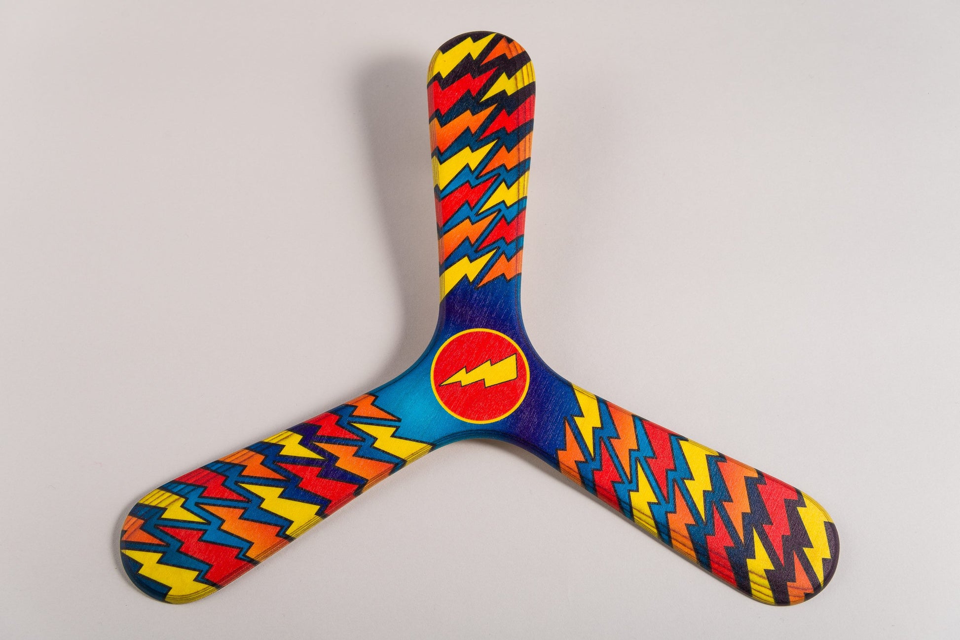 Jeśli lubisz zabawę i kolory, pokochasz piękny design błyskawicy. Idealny dla początkujących, bumerang błyskawica jest odpowiedni tylko dla praworęcznych. Jego maksymalna odległość lotu wynosi od 20 do 25 metrów przy lekkim wietrze. Nie potrzebujesz silnego ramienia, aby dobrze się bawić tym bumerangiem.